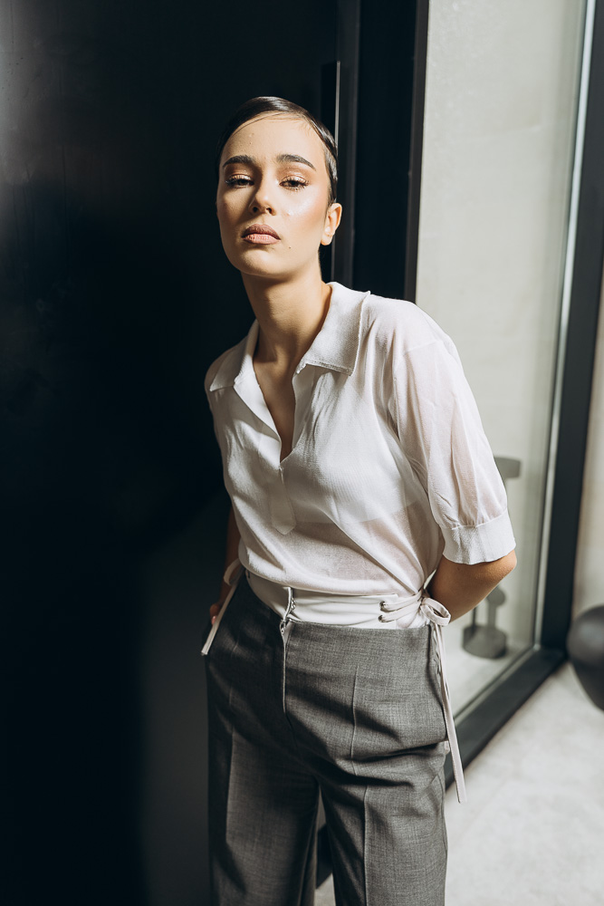 Pantalon din stofa lana premium, tesatura subtire si confortabila. Model cu detaliu in talie, bata din piele naturala si snur regalbil lateral, lejer pe picior si buzunare laterale. Pantalonul este o piesa versatila ce poate fi usor integrata in tinutele from day to night.