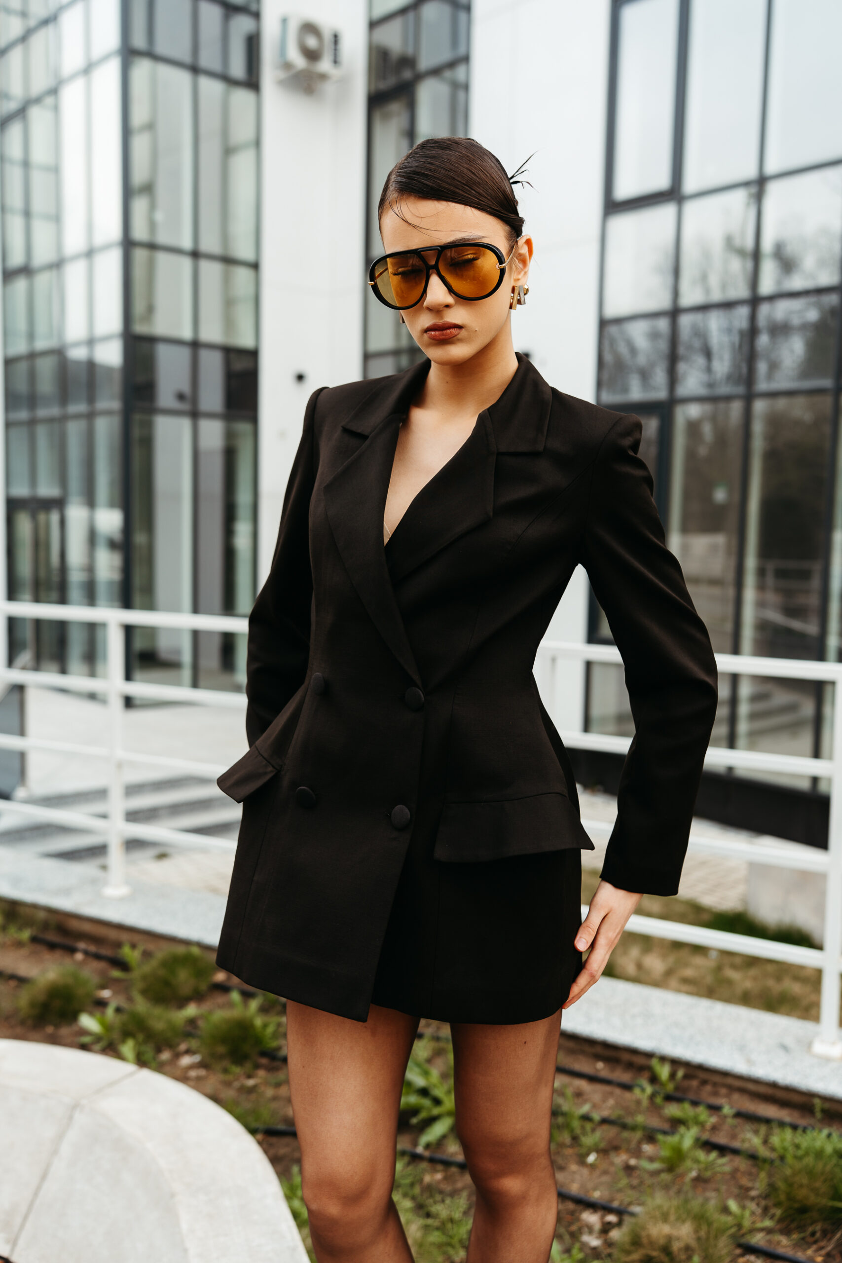 Sacou din stofa de lana cu design cambrat, si sold proeminent. Design cu guler si rever, detalii in zona soldului unde arhitectura este una structurata. Inchidere la doua randuri de nasturi, buzunare in fata. Poate fi purtat atat ca rochie, cat si ca parte a unui costum, cu pantaloni din aceeasi colectie.