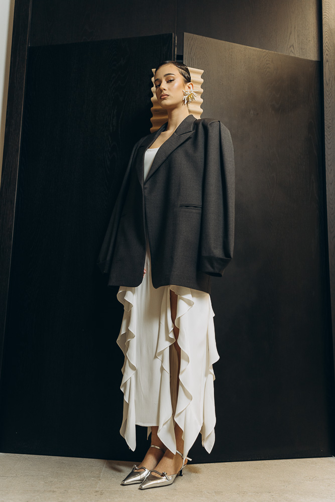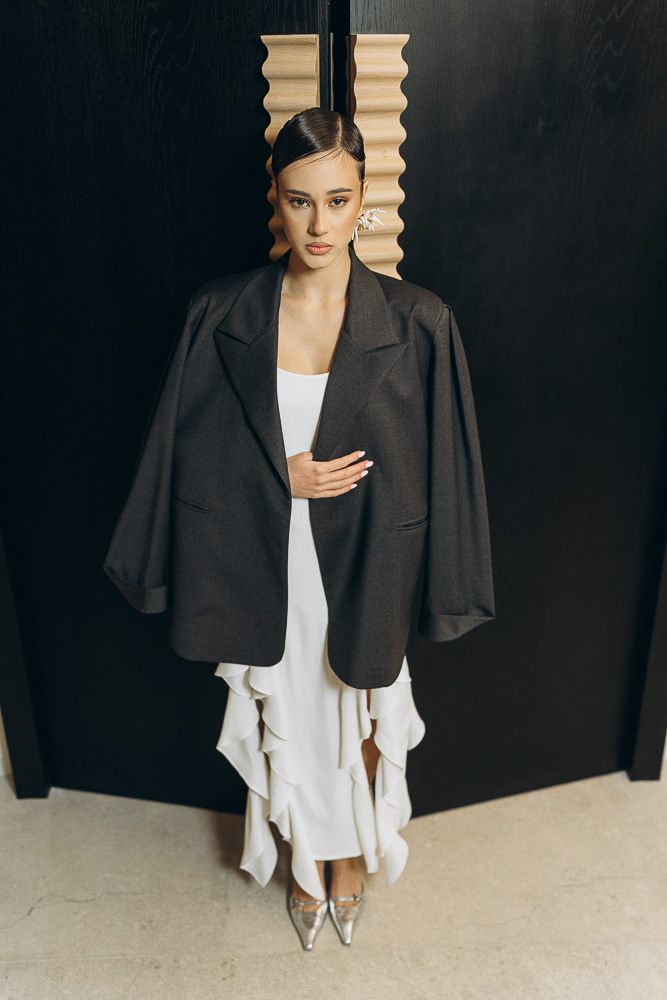 Rochie din voal de matase, captusita, design cu lungime asimetrica. Rochia are 2 slituri in fata, 2 in spate cu volane aplicate. Pe umeri se ajusteaza cu un snur de matase. Rochia este o piesa versatila, atemporala ce poate fi usor integrata in tinutele from day to night. Se potriveste la multe tipuri de conformatii datorita formei lejere, talia poate fi accentuata cu usurinta cu un cordon/curea. Poate fi purtata si la evenimente mai elegante, cu accesorizarea potrivita.