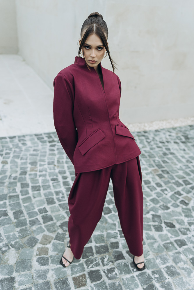 Sacou din stofa de lana cu design cambrat, detalii laterale arhitecturale care accentueaza talia. Design cu guler pe gat, sistem de inchidere cu capsa metalica in forma de floare, maneci cu volum.