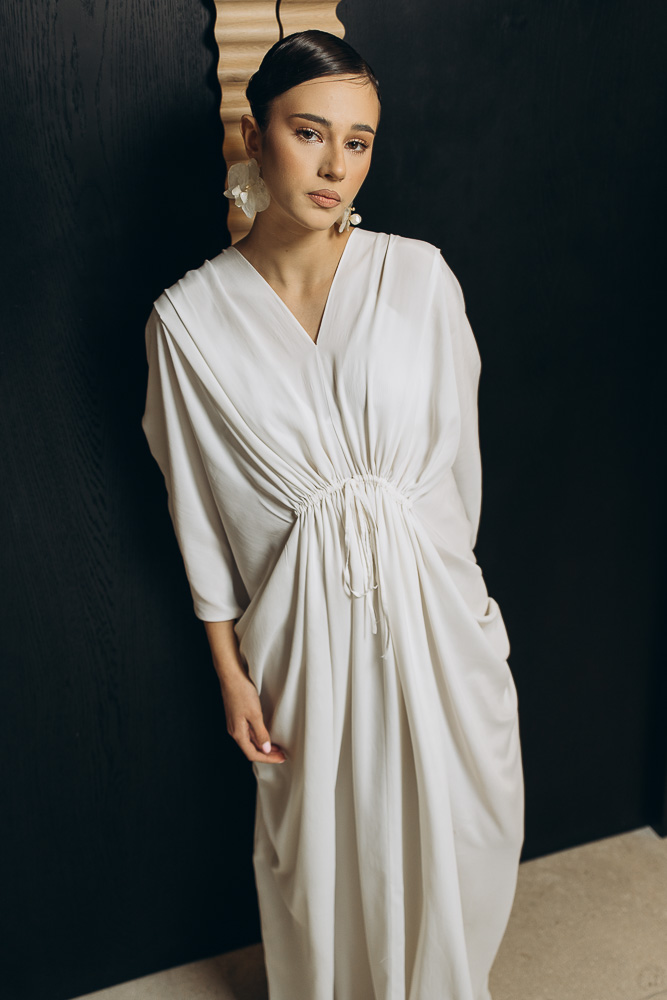 Rochie din voal de matase, design cu lungime usor asimetrica. Rochia are maneci cazute iar fusta are un design cu plii in zona taliei, a umerilor si pe spate. Rochia este o piesa versatila, atemporala ce poate fi usor integrata in tinutele from day to night. Se potriveste la multe tipuri de conformatii datorita formei lejere, talia poate fi accentuata cu usurinta cu un cordon/curea. Poate fi purtata si la evenimente mai elegante, cu accesorizarea potrivita.