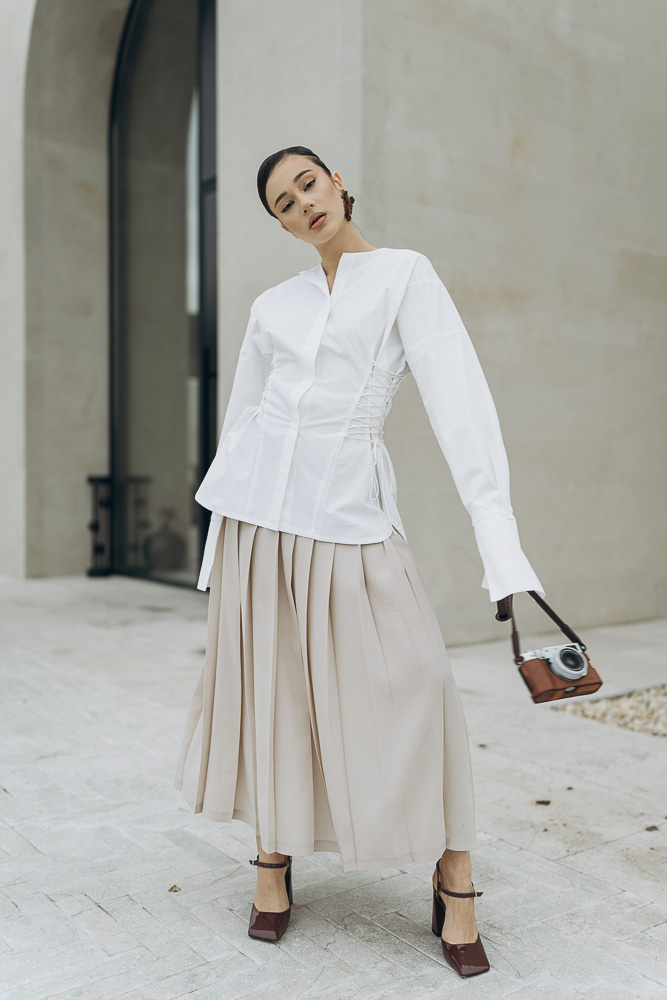 Top camasa din bumbac plin, design cu maneci lejere si mansete detasabile. Largimea se poate regla cu un snururi laterale care accentueaza talia. Topul este o piesa versatila ce poate fi usor integrata in tinutele from day to night.